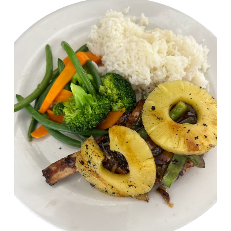 A thick center cut, Frenched pork chop, and pineapple served with rice and vegetables
