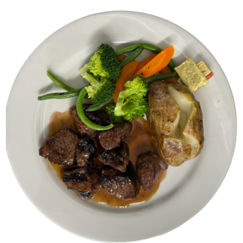 Marinated in bourbon sauce, cooked to your liking, served with potato and vegetables