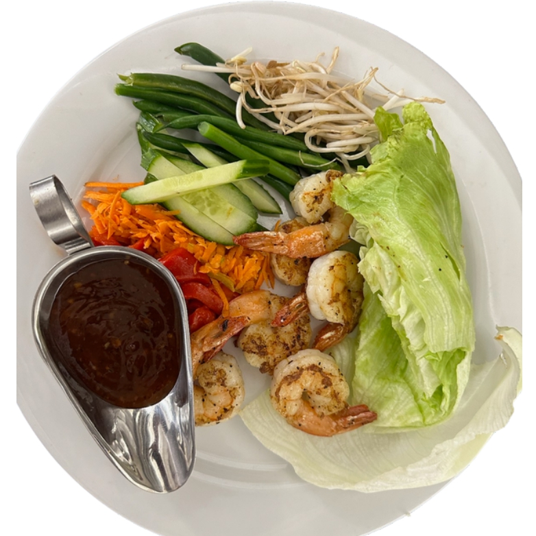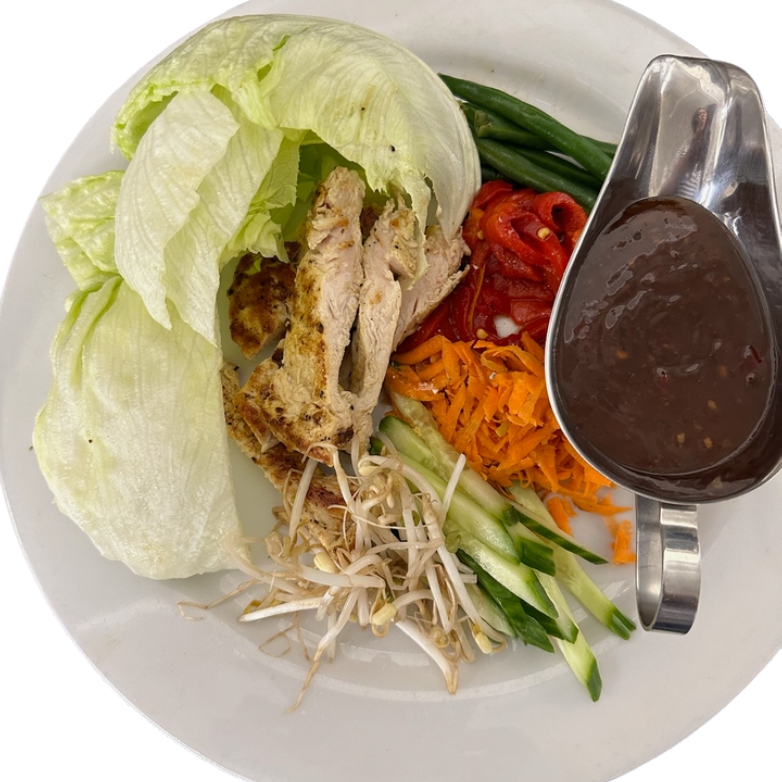 Create your own lettuce rolls! Asian with fresh green beans, roasted red peppers, carrots, cucumber, bean sprouts and grilled chicken, served with a sweet chili dipping sauce